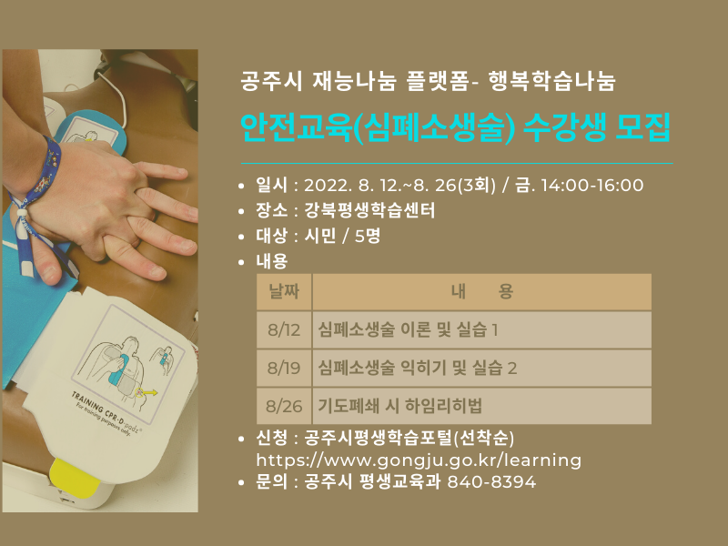 강좌명 안전교육(심폐소생술) 교육기간 2022-08-12~ 2022-08-26