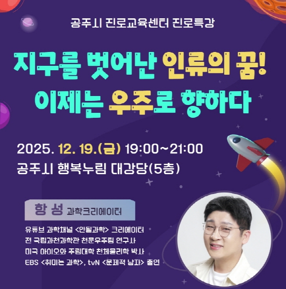 | 강좌명 | 공주시 진로교육센터 진로특강(과학크리에이터 항성) | 교육기간 | 2025-12-19~ 2025-12-19 |